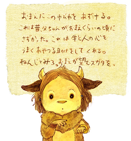 ふしぎなことって起こるもんだ。 あそこに立っている 大きな体の、若い牛と 綺麗な赤毛の女性が見えるかい?